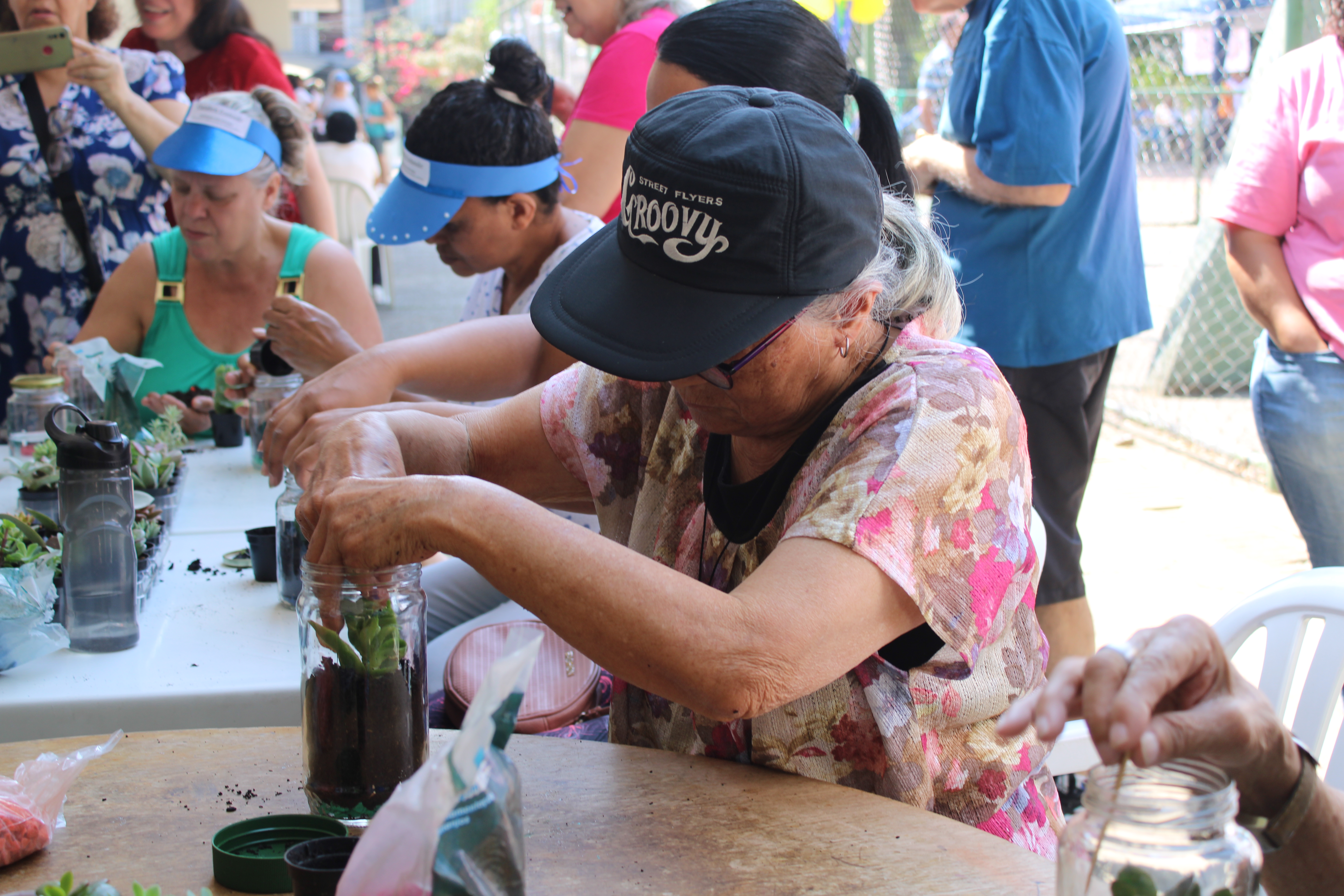 Sessões de zumba, alongamento e oficinas de terrário e de kokedama complementaram a programação do encontro, além de cuidados com a beleza e autoestima com corte de cabelo e penteados realizados de forma voluntária por uma instituição parceira.
