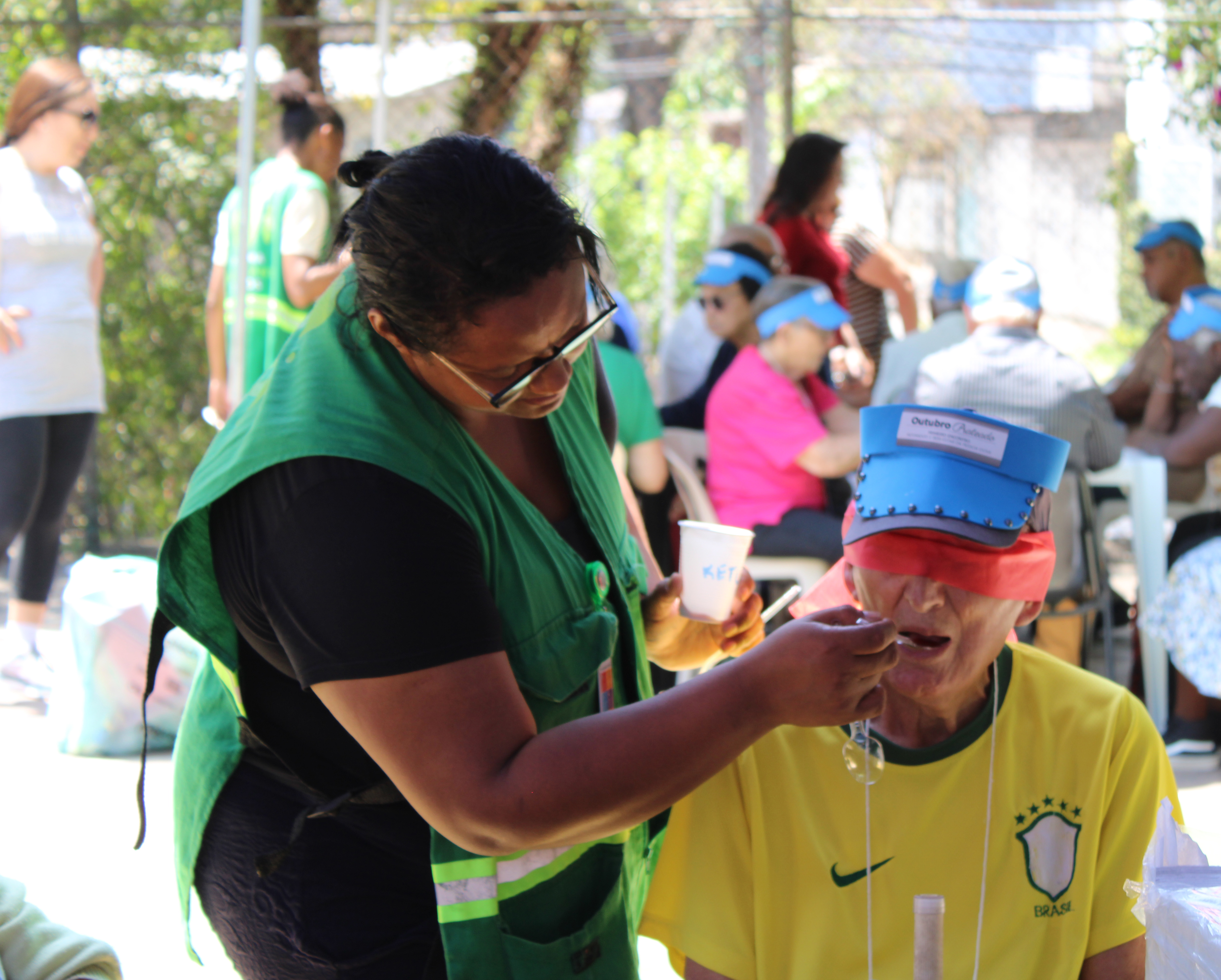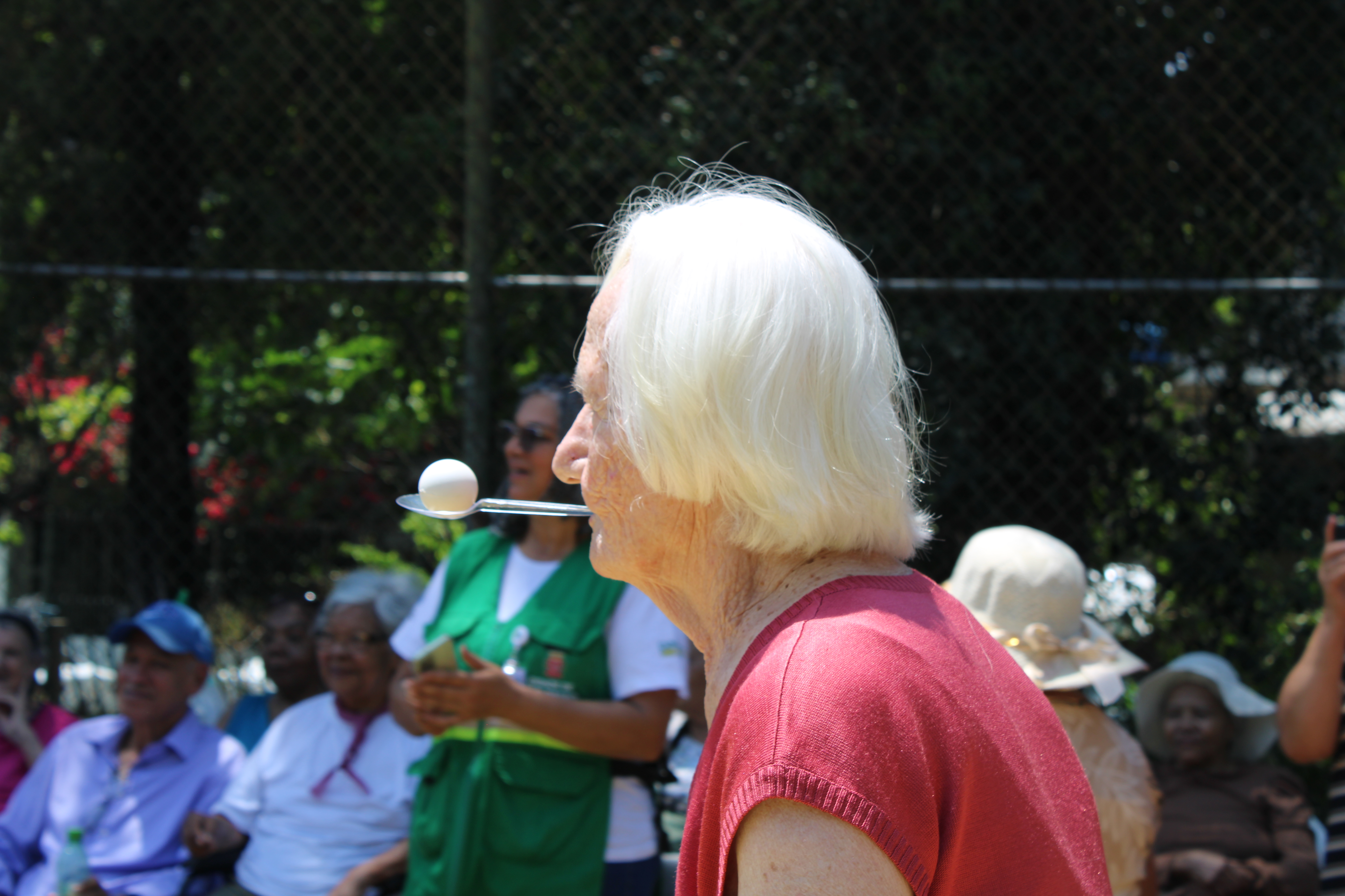 Outra atividade testou o tato, olfato e paladar dos idosos, que tinham que descobrir, às cegas, o que estavam segurando, cheirando ou degustando. Além disso, a equipe organizou a caminhada do ovo na colher, para estimular o equilíbrio e a concentração.