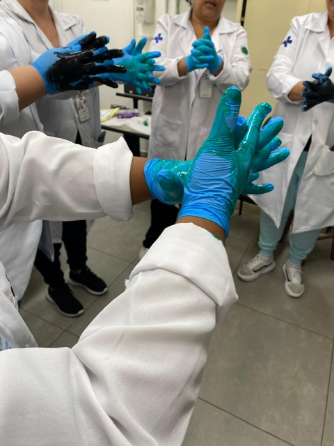 Além disso, foi ressaltada a técnica correta de higienização e realizadas atividades práticas, com a aplicação de tinta e outras substâncias, para enfatizar as áreas das mãos frequentemente negligenciadas no momento da limpeza.