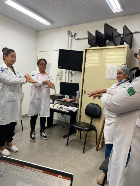Outro assunto abordado por meio de treinamento foi a higienização das mãos, prática que, quando realizada corretamente, previne a proliferação de infecções e consequentes mortes. Na ocasião, foram reforçados os 5 momentos da higiene das mãos, conforme as diretrizes internacionais de segurança do paciente: