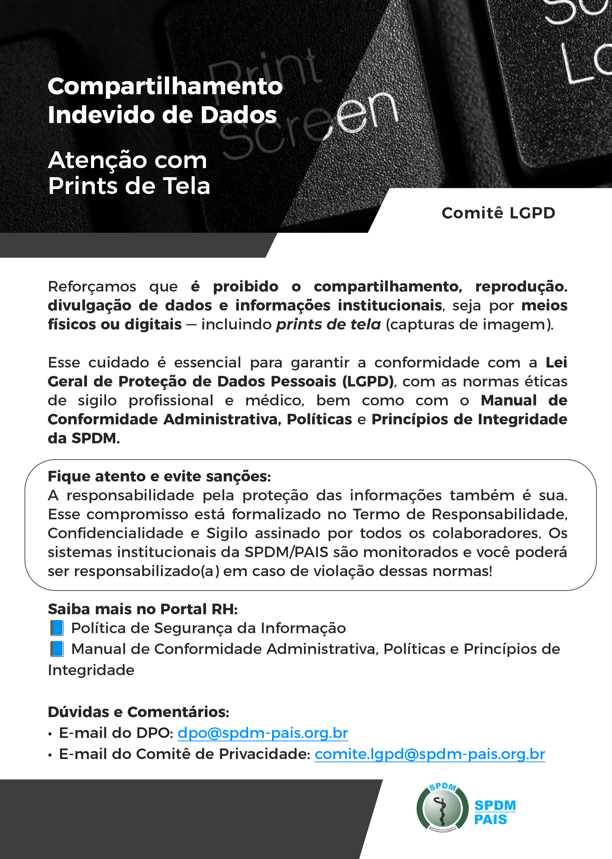 Tipos de Canais de Comunicação SPDM/PAIS: Canal Confidencial, E-Mail de Combate ao Assédio, Entrevista de Desligamento, SAU / Ouvidoria, Fale com o Pais e Assessoria de Imprensa